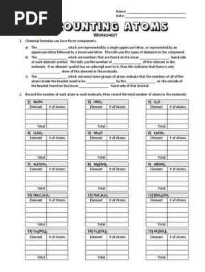 How to count atoms worksheet 1. View how to count atoms.worksheet.doc from chemistry misc at north cobb high school. Need more help, use this worksheet Chemical formulas can have three components. Atoms worksheet #2 (the mole). Determine how many atoms of each element are present in the following compounds:. Nov 16, 2016, 6:41 am. 2) write down how many of that particular atom there are. Write the quantity of atoms of each element opposite the formula of the. Which are represented by a single uppercase letter, or represented by an. Then write the total number of atoms. Count the atoms for each element; The symbol of an element represents one .